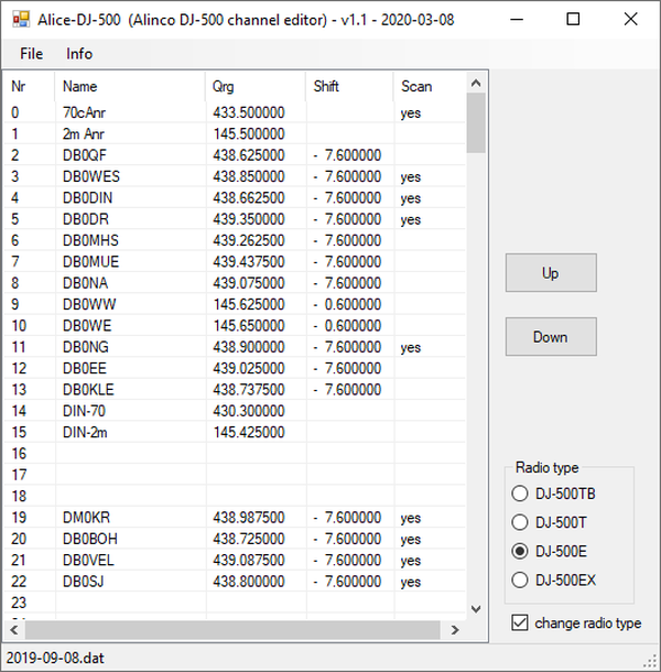 Open *dat file edit the channel list change the radio type if you want to use the list for different DJ-500 type save file program file to radio via original Alinco software